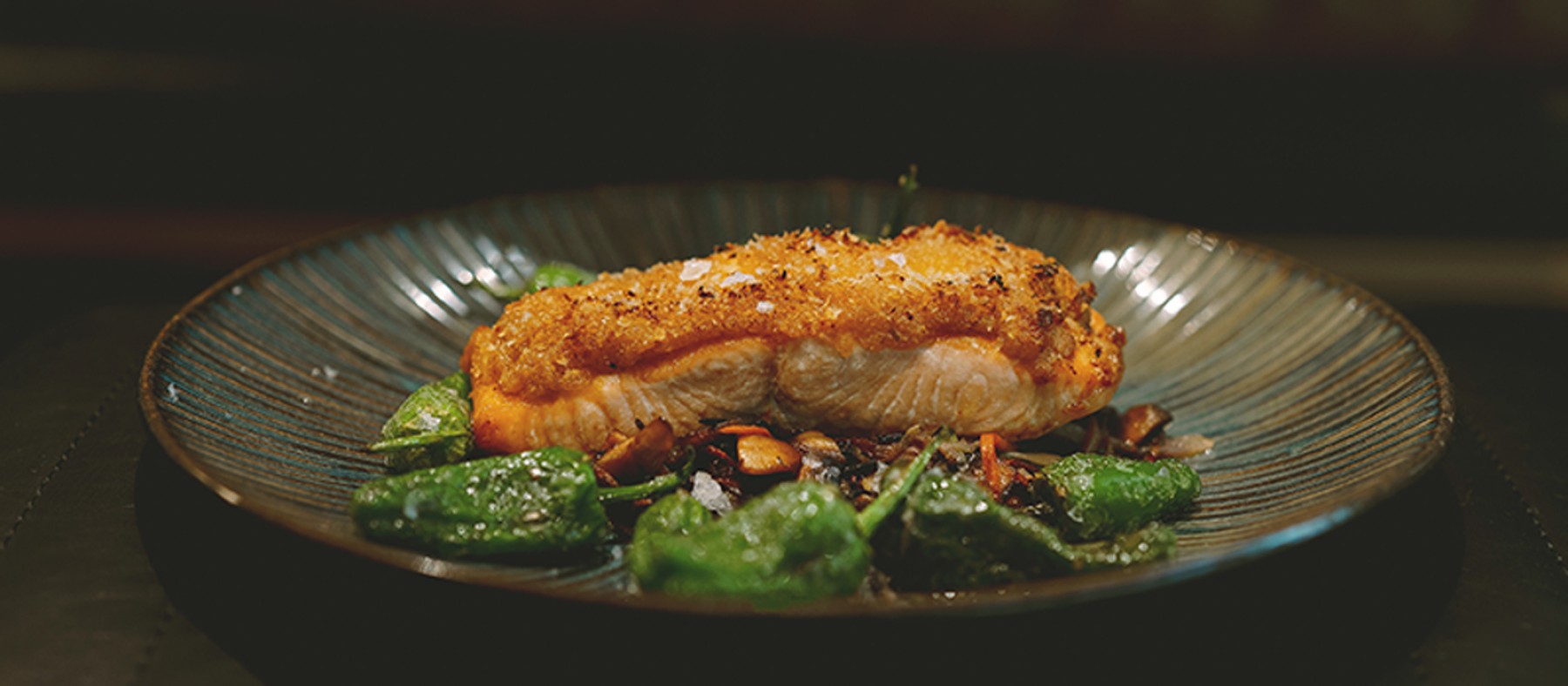 Acompañada con uvas, nueces, mermelada de tomate y picos